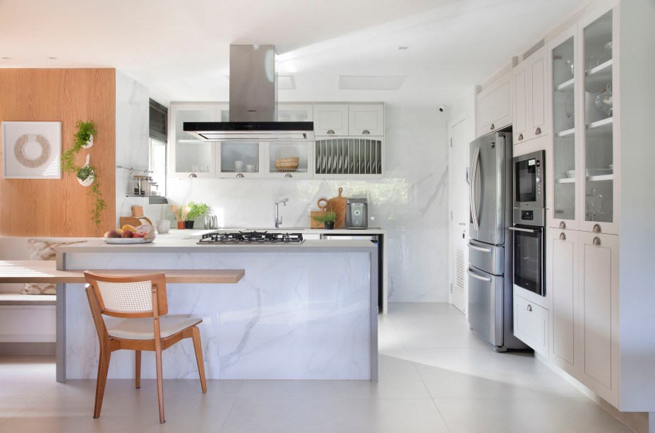 Os moradores apresentaram à arquiteta algumas demandas para o novo lar: um espaço claro e integrado, valorizando a vista, com a cozinha conectada à sala, mas com a possibilidade de fechamento; bancada gourmet na varanda da sala; cozinha num estilo mais clássico com uma ampla mesa de refeição; banheiro maior no quarto do casal; escritório mais reservado; rede na sala e no quarto.