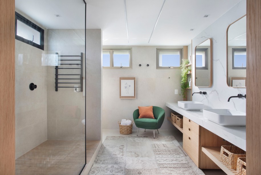 “No geral, nosso projeto buscou valorizar as belezas naturais do entorno, trazendo-as para dentro dos espaços, inclusive através da materialidade que adotamos. Na varanda da sala, por exemplo, o jardim vertical se mistura às copas das árvores externas, enquanto as paredes dos quartos ganharam texturas que lembram a areia da praia. Além disso, lançamos mão de muita madeira e pontuamos o décor com outros elementos também naturais, como palha e cerâmica”, informa Amanda.