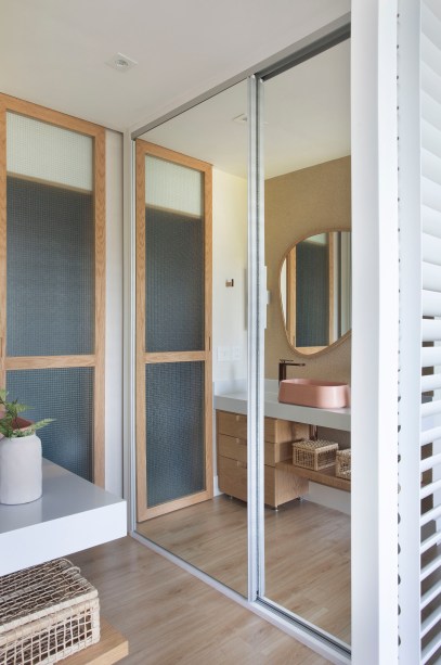 Na suíte da filha, a arquiteta deslocou a parede do banheiro para criar um espaço de bancada/penteadeira, com mais iluminação natural, já que, como o espaço está voltado para o interior do apartamento, não há aberturas de janelas.