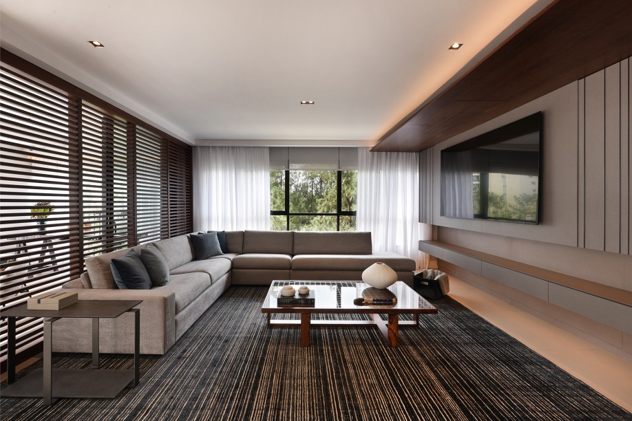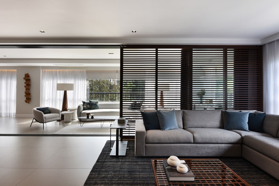 O home theater integrado ao living e ao terraço é setorizado com uma brise horizontal, que divide os espaços de forma leve, sem impedir a passagem da luz natural.