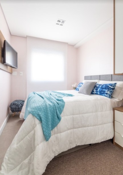 Um dos desafios do projeto foi um pedido da moradora: muito espaço para guardar suas roupas e pertences. Devido à metragem enxuta, as profissionais precisaram se adaptar e a solução encontrada foi diminuir a sala de estar e criar um guarda-roupa extra dentro do dormitório – que já contava com um armário em ‘L’.