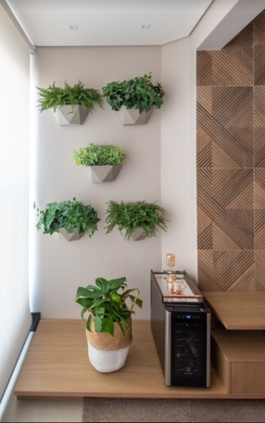 A grande extensão da varanda garante uma boa iluminação natural, sem contar que ela abriga charmosos vasos de plantas pendurados na parede, os quais trazem um pouco de verde para dentro do apê.