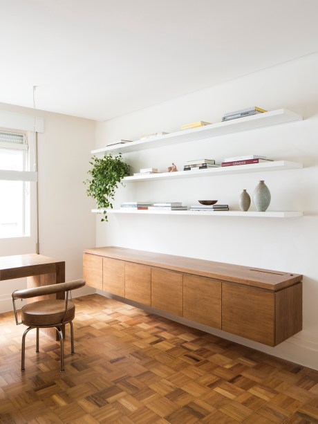 Como o taquinho era uma característica marcante do apê, as arquitetas tiraram proveito dele para fazer uma marcenaria com o mesmo tom, assim destacando-o e contrabalanceando-o com paredes brancas e uma estante leve.