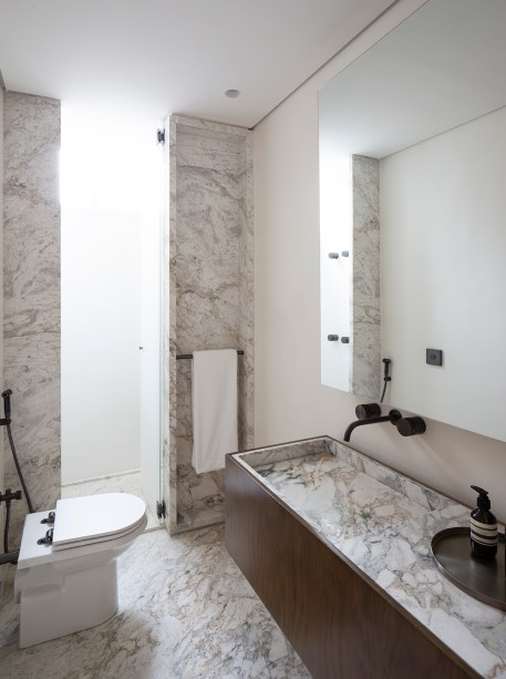 “O apartamento tinha uma suíte e dois dormitórios que dividem um banheiro – um usado como escritório e o outro para receber os sobrinhos que dormem lá algumas vezes. Por conta disso, a moradora optou por um banheiro a mais que dividisse o uso entre receber sobrinhos para dormir e, ao mesmo tempo, ser bonito para receber as visitas e ter cara de lavabo“, contam as arquitetas.