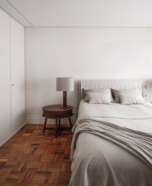 Com exceção do piso de taco de madeira e um dos dormitórios, onde a moradora inseriu seus móveis antigos, todo o restante do apartamento foi trocado.