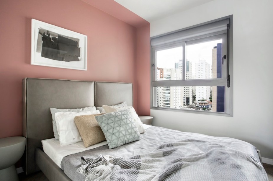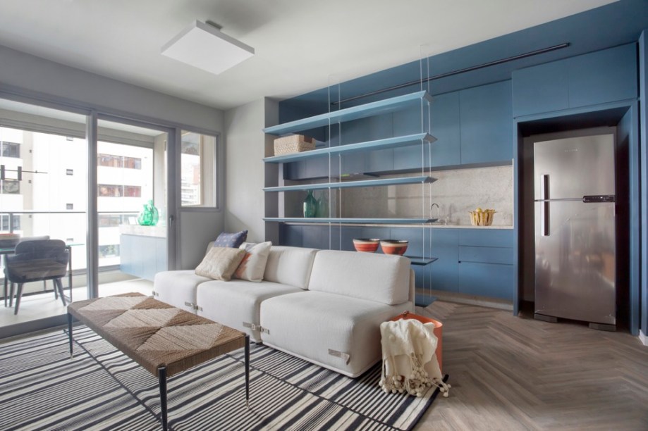 Na estrutura, houve pouquíssimas intervenções que foram suficientes para tornar o espaço moderno e aconchegante. Chamam a atenção as cores do projeto. Na cozinha, o azul toma conta da marcenaria e das paredes, que se destacam e delimitam o ambiente. Já no quarto a parede de cabeceira recebeu um tom rosé, que o torna mais íntimo e aconchegante.