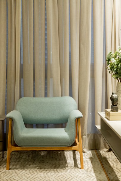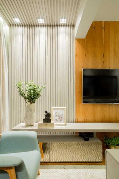 O apartamento agora evidencia o mobiliário confortável para ser aproveitado em momentos de descanso e diversão. “Na sala, optamos por um sofá convidativo com almofadas ideal para repousar. Boa parte das paredes são revestidas em madeira de freijó natural e ajudam na composição de um ambiente calmo e acolhedor”, explicam os profissionais.