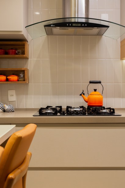 Com iluminação pontual, a cozinha traz armários espelhados que passam a impressão de amplitude ao cômodo reduzido. No ambiente o toque de personalidade foi garantido pelo uso inteligente dos móveis planejados e do porcelanato com efeito de ladrilho hidráulico.