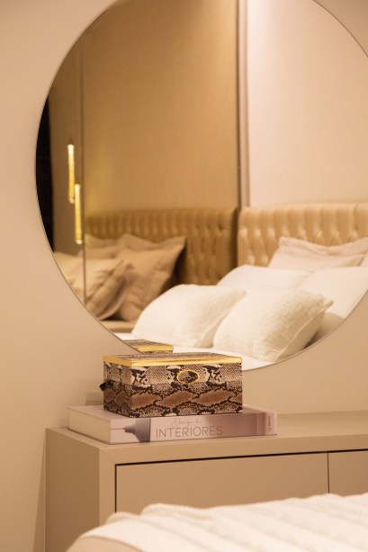 Em sintonia com a atmosfera tranquila do apartamento, o quarto oferece possibilidades funcionais e agradáveis, como os pendentes que ajudam a compor com pontos de luz o clima suave e relaxante. O projeto ainda traz espelhos no guarda-roupas e na parede, além de uma cabeceira estofada que emoldura a cama e colabora com o conforto visual.