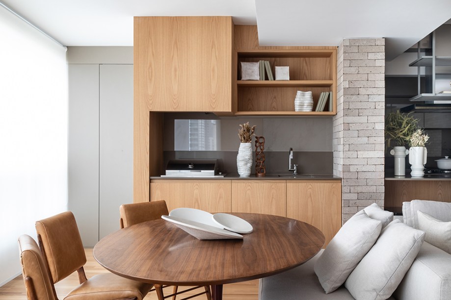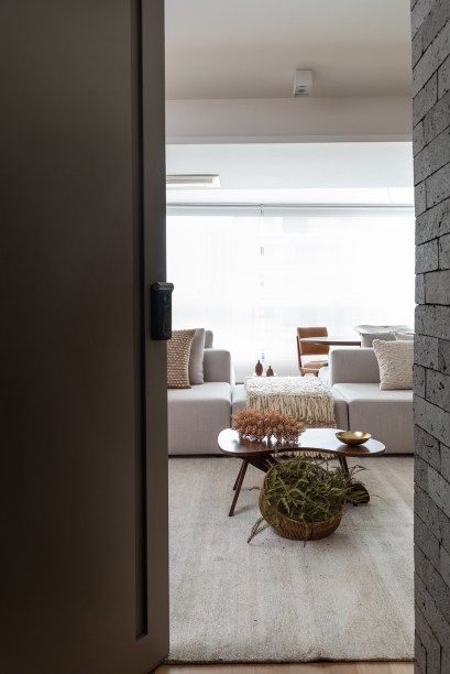 Como a moradora é bastante ligada em medicina ayurvédica, meditação, óleos essenciais e cristais, a atmosfera e a estética do projeto é super zen. O mobiliário é claro e os materiais principais são tecidos, madeira e couro, que dão toques de caramelo e marrom.