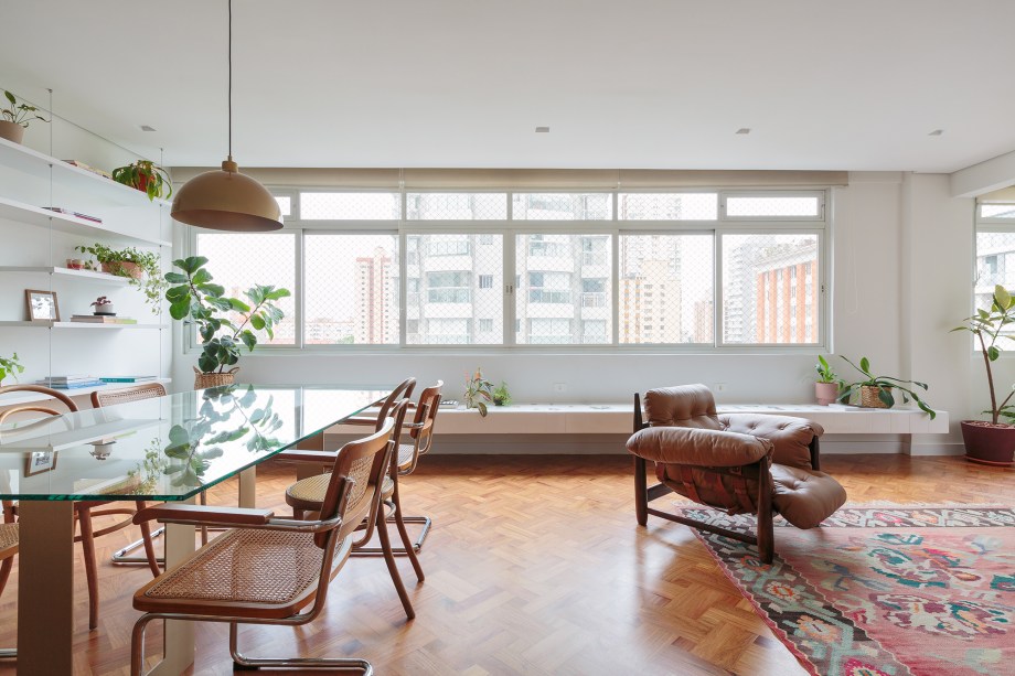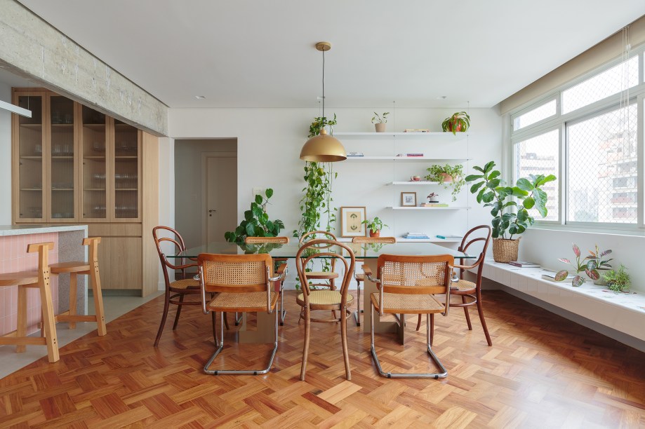 A sala de jantar traz uma mesa de tampo de vidro da Alessandra Delgado e uma variedade de cadeiras que acrescentam personalidade ao ambiente. Uma estante suspensa de marcenaria, reforçada por tirantes, serve como decoração e também como apoio para almoços.