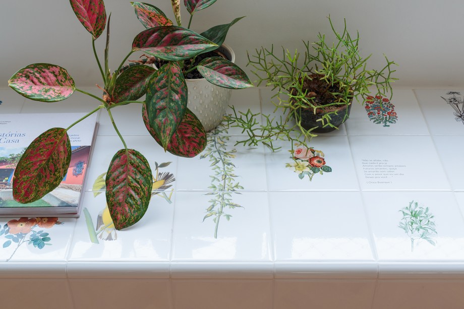 A equipe também atendeu ao desejo dos clientes de ter uma parede de destaque na sala, realçando a janela ampla. Para isso, propôs um banco revestido com azulejos únicos e cheios de personalidade, criando um ponto focal no ambiente. Os azulejos foram cuidadosamente escolhidos, com desenhos que variam de referências botânicas a letras de músicas de Chico Buarque, todos selecionados em colaboração com os clientes, resultando em um painel de azulejos exclusivo, onde nenhum se repete.
