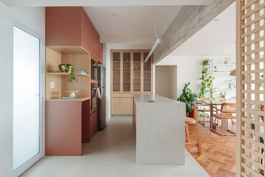 Entre a cozinha e a sala de jantar, a equipe propôs uma ilha com banquetas Girafa de Lina Bo Bardi, que proporciona um espaço de apoio e integração entre os ambientes. A escolha do granito itaúnas escovado para a bancada traz textura e uma sensação tátil ao projeto. A marcenaria escolhida mescla a cor terracota com a madeira, adicionando um toque vibrante ao projeto, que se integra harmoniosamente à sala.
