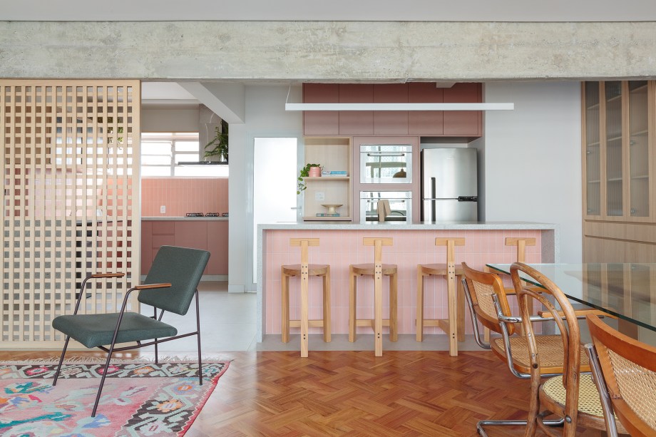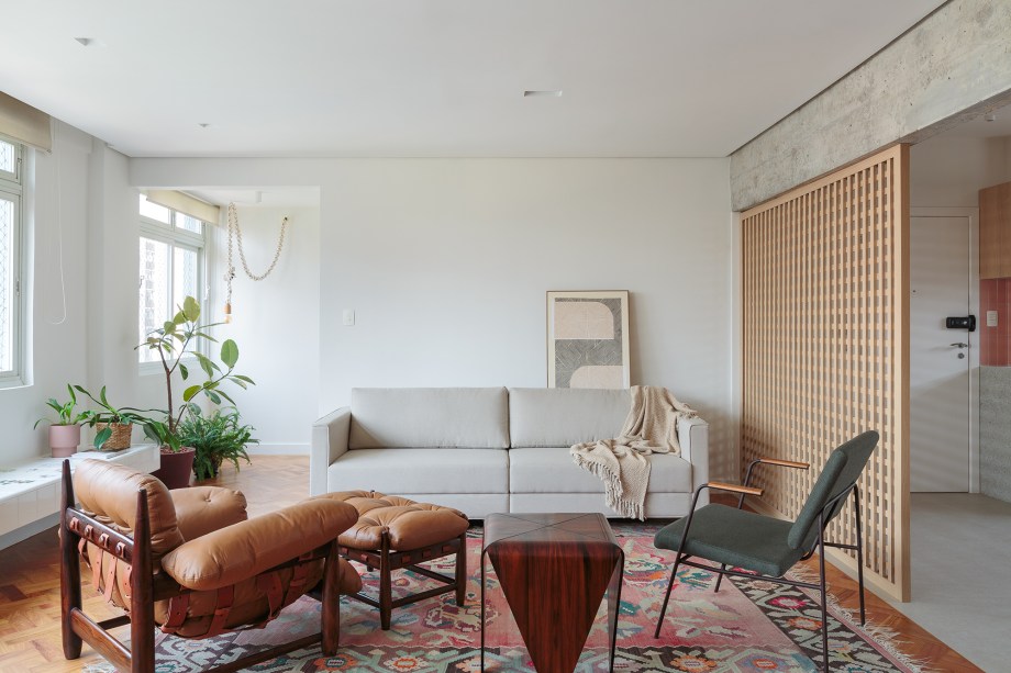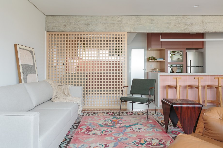 Na sala de estar, a arquiteta optou por um sofá neutro para destacar a Poltrona Mole em couro e a poltrona Laura da Alessandra Delgado, complementadas por um tapete estampado que envolve todo o layout. A introdução de um muxarabi em marcenaria não apenas adicionou um elemento estético à sala, mas também parcialmente divide a cozinha, mantendo a sensação de espaço aberto.