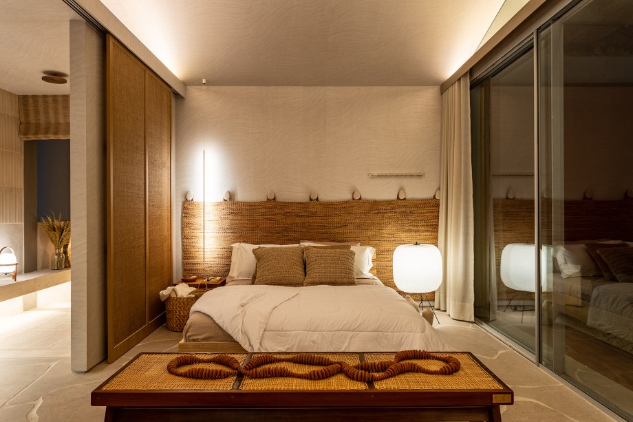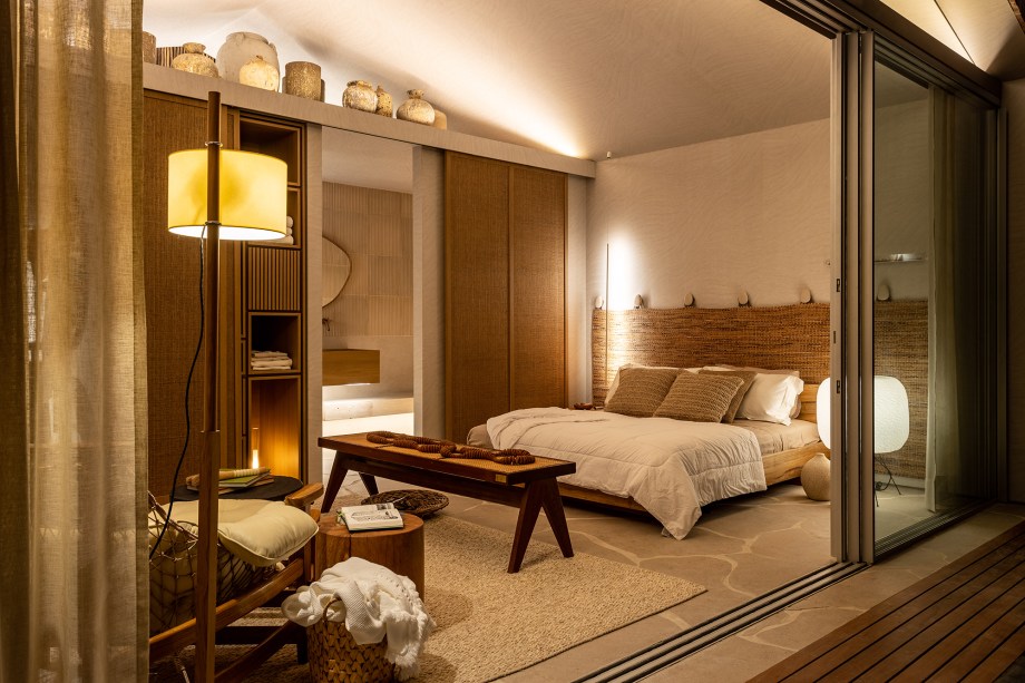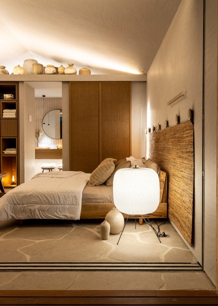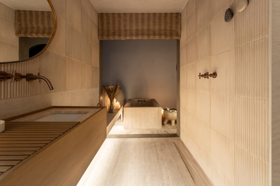 Com 36 m², a casa é apresentada no formato de suíte, com destaque para a copa de apoio pequena e prática, a banheira de mármore bruto esculpido e os móveis com design atemporal.