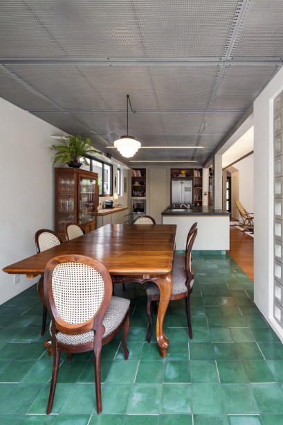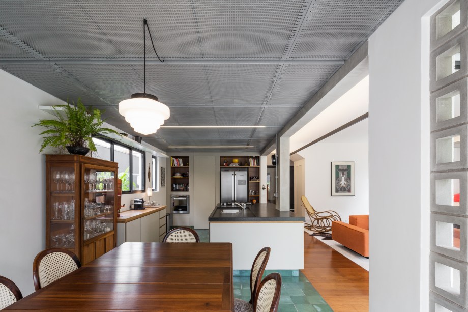 Os materiais utilizados são predominantemente simples e comuns, como o aço, o concreto e a madeira. Um destaque especial é destinado para o forro da cozinha, feito em chapa metálica perfurada que, por sua vez, contém as luminárias embutidas.