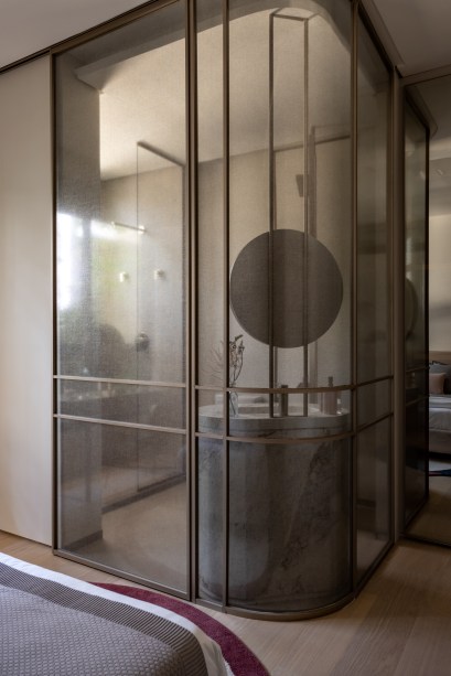 Enquanto isso, a disposição do layout do banheiro master, com uma banheira central, proporciona a sensação de um verdadeiro spa. Aqui, diferentes texturas e acabamentos foram aplicados criando um interior extremamente elegante e rico.