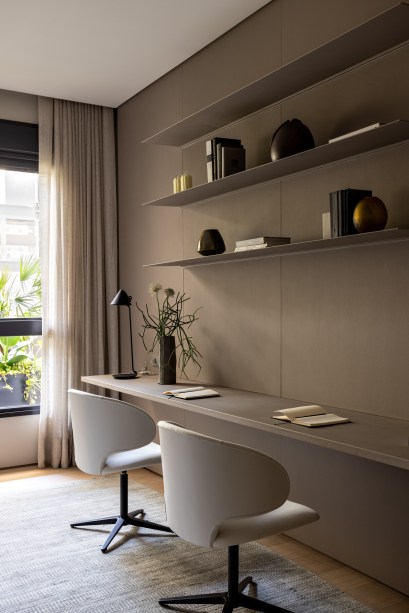 “Na área íntima, criamos ambientes onde o morador se conecta com a sua essência. Para o home office, pensamos em um ambiente mais monocromático, com parede revestida em couro, para as horas mais introspectivas”, explicam os arquitetos.