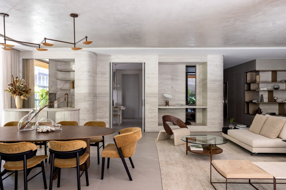 Os arquitetos combinaram móveis de design brasileiro com a arte e arquitetura contemporânea, cujas curvas tornam a circulação convidativa e visualmente agradável.