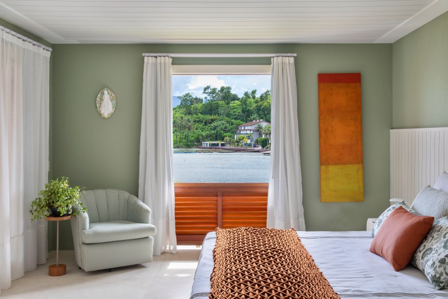 “Foi o caso do sofá vermelho terroso do estar integrado à varanda e à área gourmet, o painel de parede em laca verde azulada e o pufão em couro vermelho rosado da sala de tv, o espelho de chão com moldura verde da sala de jantar e os inúmeros adornos e almofadas que harmonizam com todas essas cores, extraídas da natureza ao redor”, acrescenta ela.