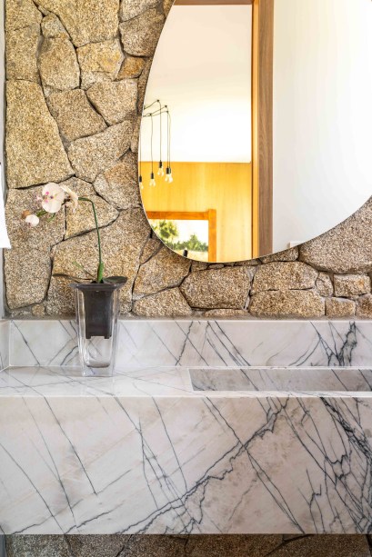 No lavabo, pedras moledo vestem as paredes, que também ganha um espelho em formato orgânico.