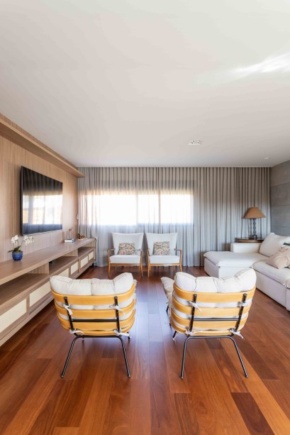 Ao entrar na residência, temos à direita um jardim de inverno, que fica entre a sala de TV e o escritório – ambos possuem vista para o verde, que se tornou protagonista no andar térreo.