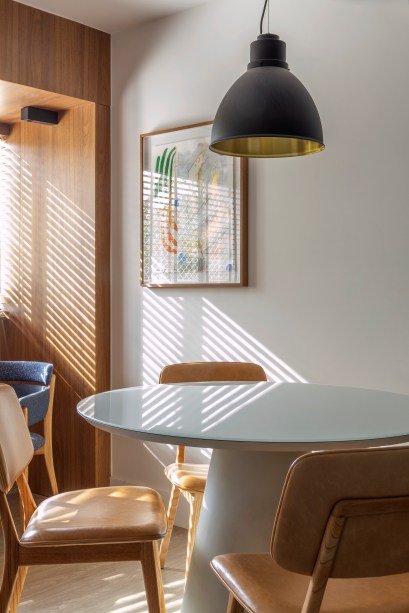 Neste local privado aos adultos, os profissionais desenharam um móvel bar, que funciona como apoio para servir as refeições e para os equipamentos como uma adega, um frigobar e uma máquina de café expresso. Todos esses cômodos, refletidos em um ambiente contemporâneo nas cores azul marinho – cor preferida dos moradores – com as paredes de base no cinza e branco.