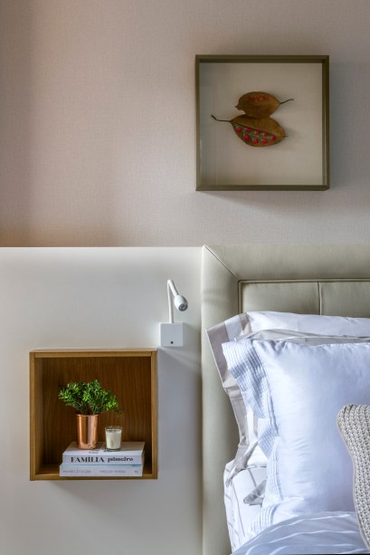 A ideia principal da área íntima foi para ser um local aconchegante, o escritório ampliou o quarto do casal para acrescentar uma mesa – onde os clientes pudessem trabalhar – e foi colocada uma cabeceira planejada de nicho embutido.