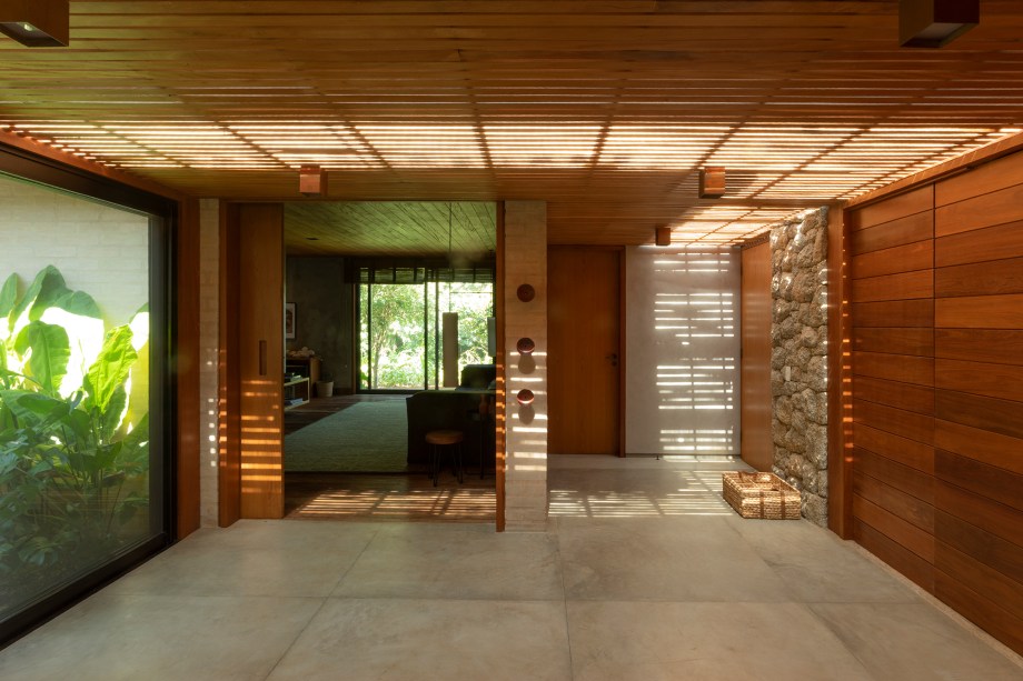 A casa de 818 m² recebeu acabamentos em madeira de peroba rosa de demolição, uma cobertura de telhado plana e grandes vãos na sala, que contribuem para a construção de um conceito contemporâneo e aconchegante.