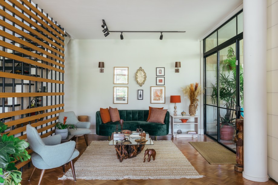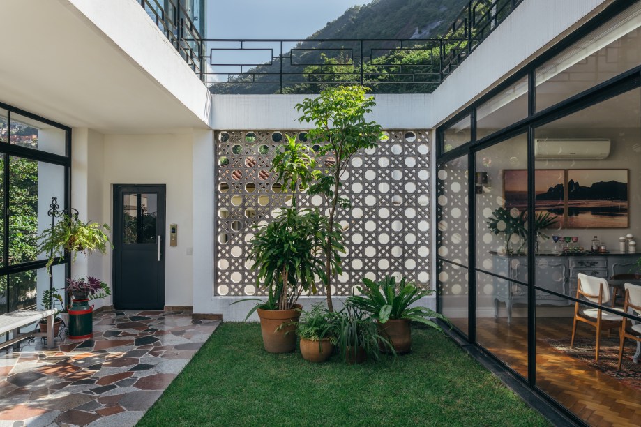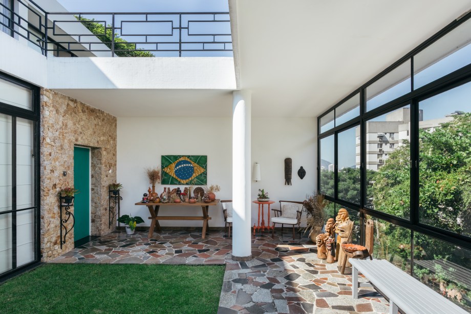 Na entrada, a brasilidade ganha destaque, com peças que remetem a diferentes regiões do país, como carrancas, imagens santas, vasos de barro e outros itens. O gramado da área faz uma conexão com a sala de jantar e cozinha, com apenas vidro separando os ambientes.