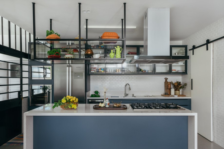 Integrada à sala de jantar, a cozinha passou por uma grande reformulação, ganhando uma ilha em marcenaria com tampo de pedra quartzo, com uma prateleira suspensa em serralheria preta e armários em vidro canelado.