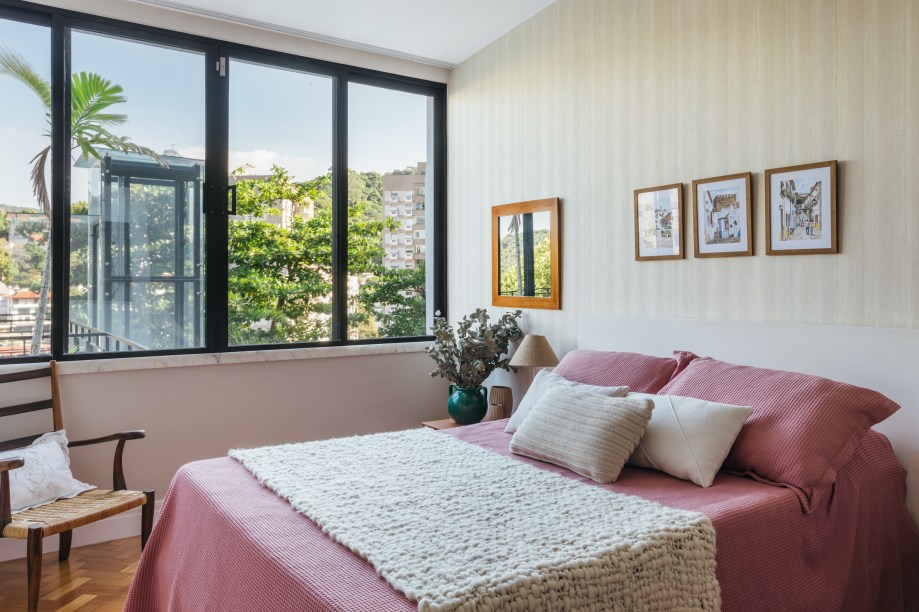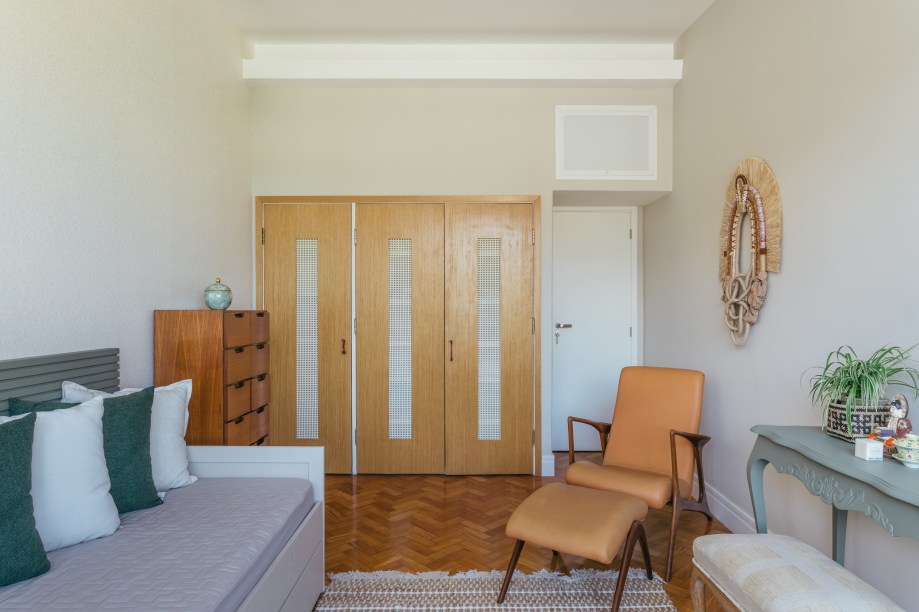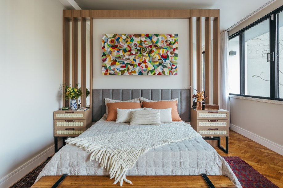 O quarto do casal, localizado no segundo pavimento, valoriza a entrada de luz. Bem ampla, a suíte serve como escritório, tem tacos originais em espinha de peixe e foi toda pensada em tons suaves e acolhedores. As cores do piso, marcenaria e parede aparecem na tela da artista plástica Claudia Ferraz.