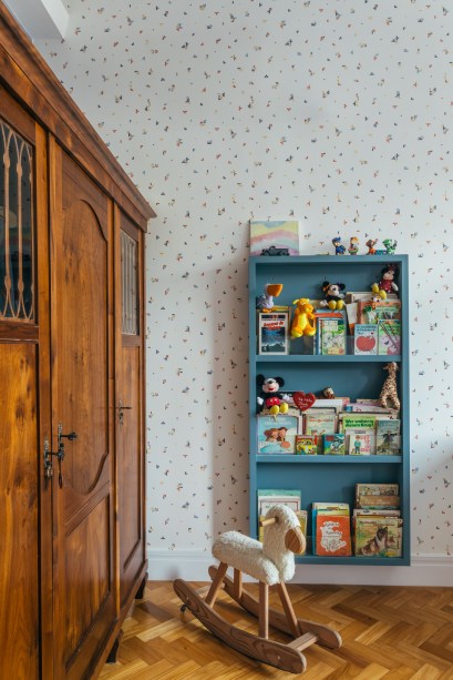 Os cinco quartos ficam no terceiro andar. “O quarto dos netos tinha que ser lúdico e grande o suficiente para abrigar os quatro netos, e espaço para as brincadeiras. Optamos por duas bicamas, um cantinho para desenho e leitura”, conta Ana.