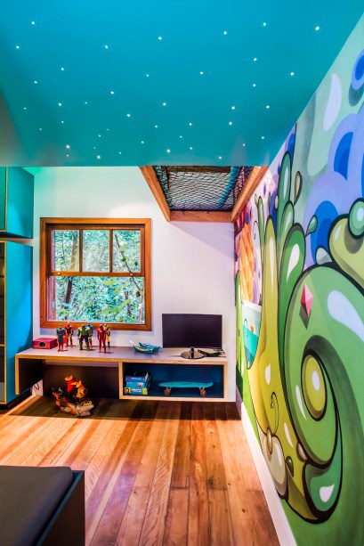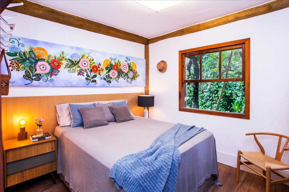 Destaque para o quadro feito por Carlito no living e para a obra da artista Lady Guedes, próxima à escada. No quarto das crianças há, ainda, um grafite do Highgraff nas paredes. Já na suíte master, um quadro do Gustavo Rosa traz cor às paredes.
