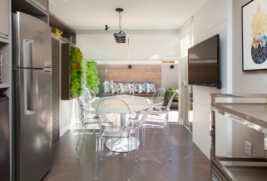Esse “grande cômodo” conta ainda com uma mesa de jantar e uma porta de vidro com acesso direto ao pátio. “A principal alteração estrutural foi em relação a cozinha, onde a tiramos da sua posição original e trouxemos mais próximo do living”, explica a arquiteta. “Além disso, aumentamos a cozinha e integramos com a churrasqueira e espaço de jantar, que anteriormente ficavam em uma área externa”, completa.