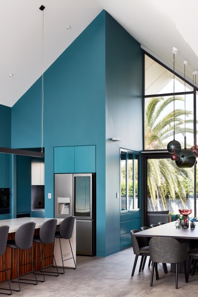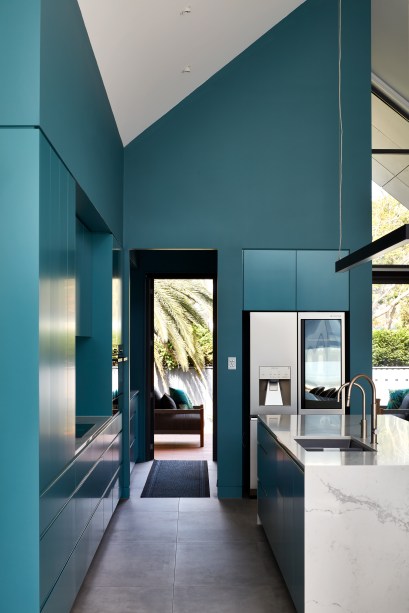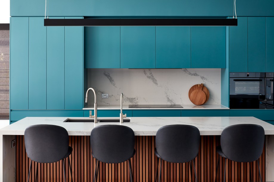 Os tons claros e sóbrios são dominantes na casa, com a marcenaria e móveis fazendo o papel de acrescentar cor aos ambientes. Na cozinha, os armários em azul funcionam como uma moldura para o cômodo, que tem as paredes pintadas na mesma cor. No centro, uma bancada de mármore com pia e espaço para quatro banquetas cria um espaço para refeições rápidas.