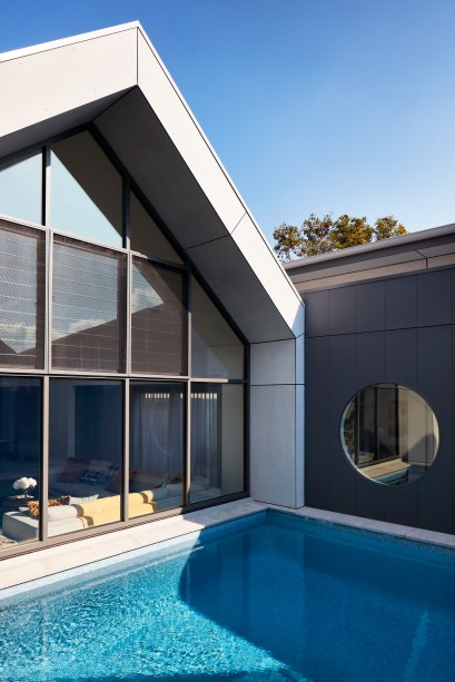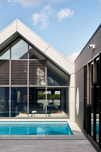 A casa é construída tendo a piscina como centro do projeto. Ela pode ser vista da sala e dos corredores que dão acesso aos outros cômodos. A fachada é feita com tijolos, com pontos vazados, como cobogós, que permitem a entrada de luz. A hall de entrada é uma área gourmet, com churrasqueira e mesa.