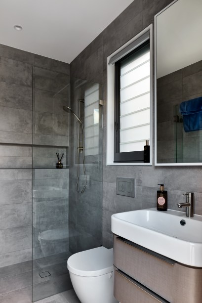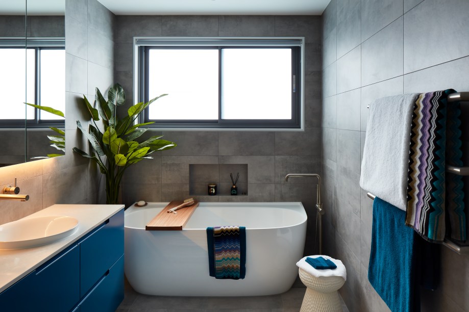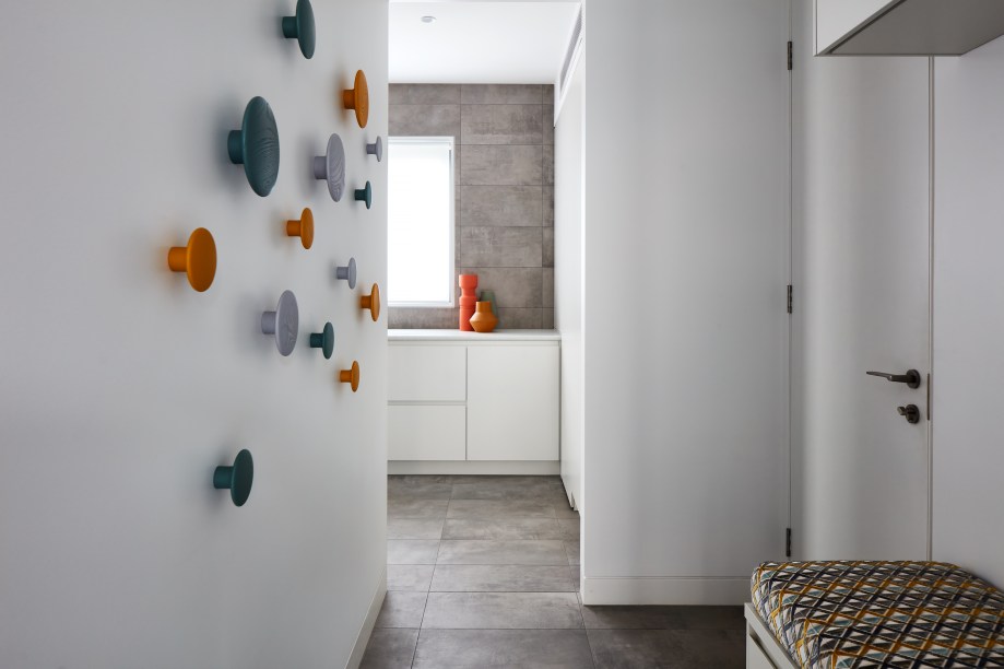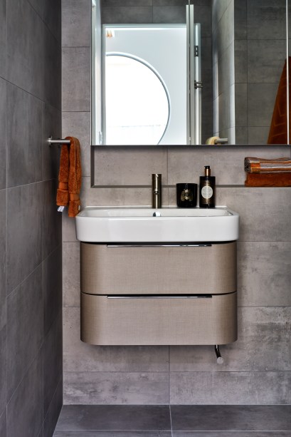 Nos banheiros, o estilo industrial segue dominante, com as paredes e chão em cimento queimado. As louças brancas foram combinadas com misturadores e torneira prata e móvel bege em um deles; prata e roxo no segundo; e dourado e azul no que também tem uma banheira.