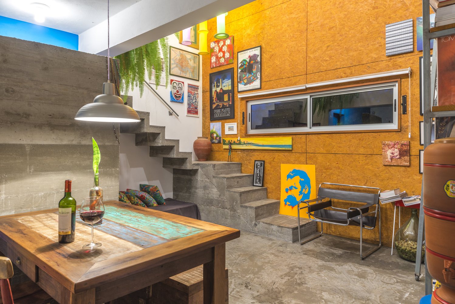 A sala de estar com pé direito duplo integra os ambientes da casa e abriga uma estante que vai quase até o teto, onde os inúmeros discos e livros dos moradores ficam. O concreto armado usado na escada aparece também em algumas paredes e vigas.