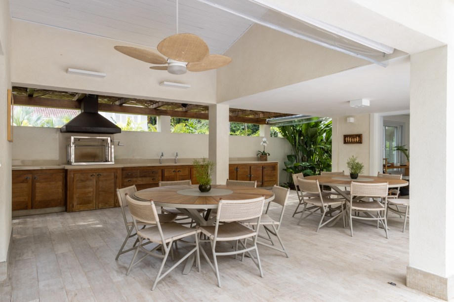 O escritório tirou partido dos tons neutros e naturais para criar uma atmosfera leve e descontraída. Usaram muita madeira natural e o tecido linho no mobiliário, sempre levando em consideração as condições climáticas do local, priorizando para a área externa mobiliários de alumínio, corda náutica e tecido próprio para exposição ao sol e chuva. Os detalhes verdes harmonizam com a natureza exuberante do local.