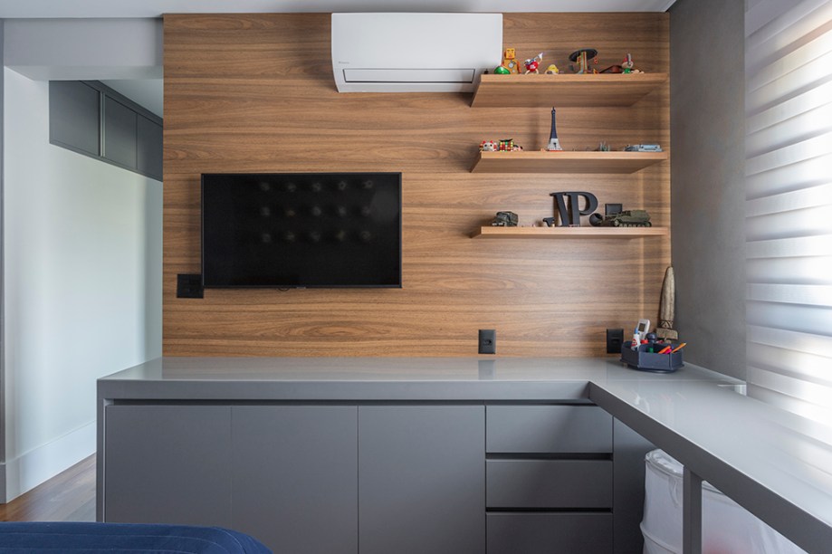 Outro diferencial do projeto, é o sistema de automação da iluminação, áudio e vídeo. Essa tecnologia somada ao telão na sala de estar criam um espaço perfeito para festas ou para dias de cinema em casa. Na cozinha, o destaque são os armários cinza escuro em contraste com o piso claro.