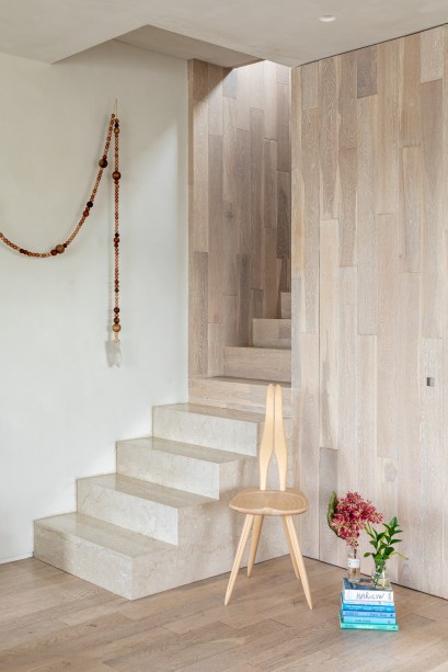 Já o living, próximo a escada, recebeu o par de poltronas Infinito, de Lia Siqueiral. E a escada também recebeu atenção espacial, sendo incorporada ao painel para dar destaque contínuo. Os degraus de fora, parte inferior, foram feitos de pedra.