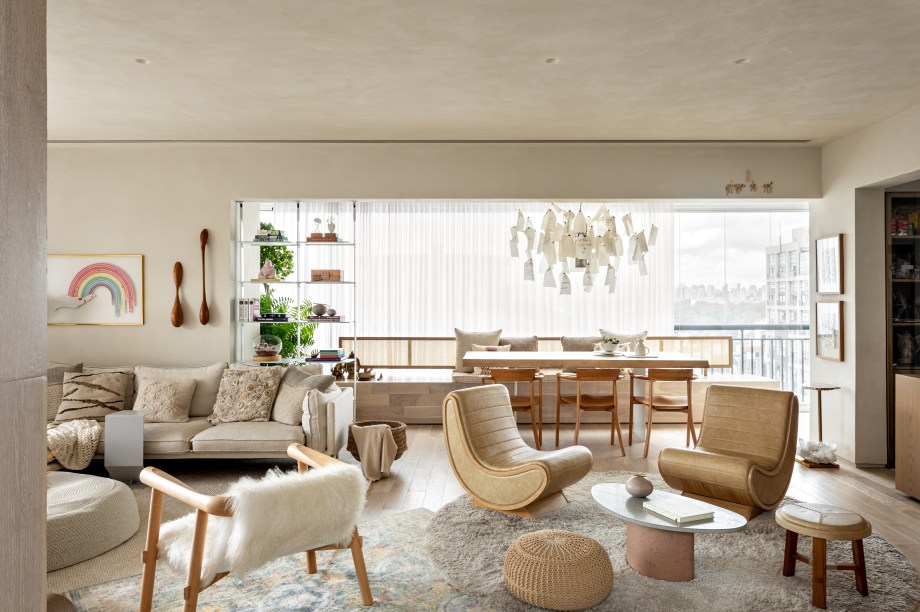 A sala de TV recebeu um revestimento de madeira que percorre o piso até a parede da TV, enquanto as demais superfícies receberam textura com base de limestone. O espaço também é palco de peças assinadas por grandes designers, como: