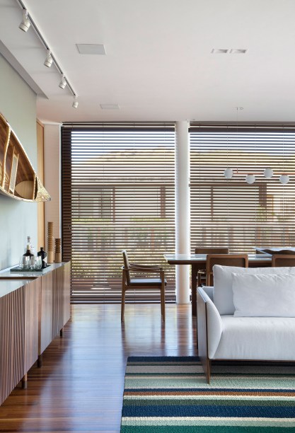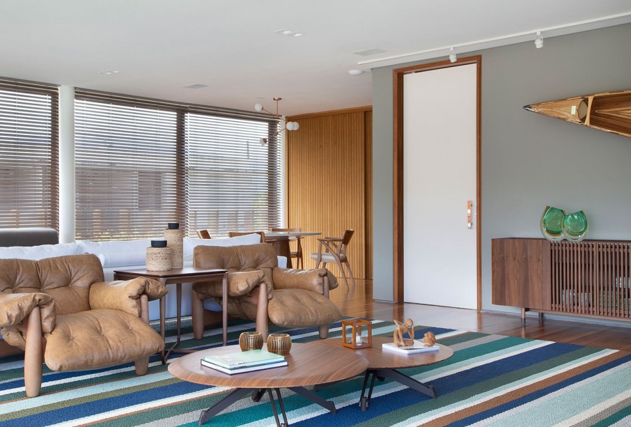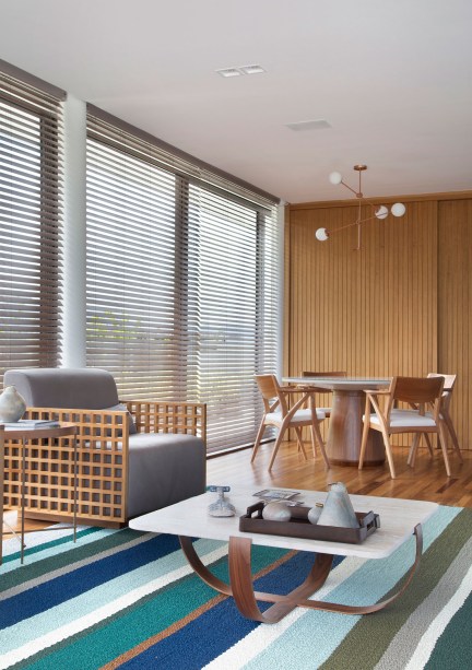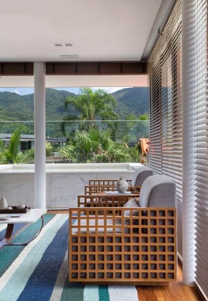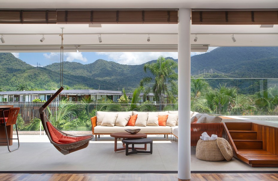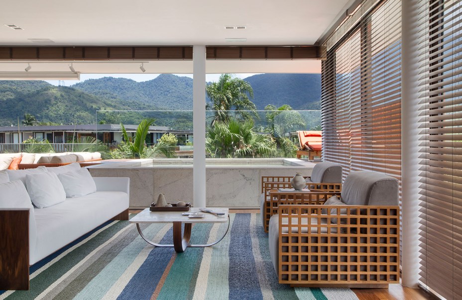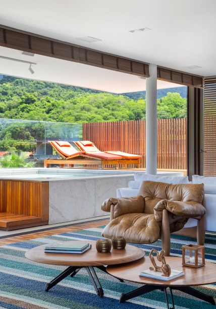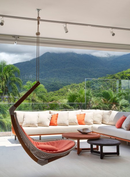 O arquiteto usou cores neutras na arquitetura e no mobiliário da área interna, reservando os tons mais vibrantes nos acessórios. O tapete listrado, por exemplo, virou grande atração na decoração da área social. Já na área externa ele se permitiu um toque de ousadia, usando a cor laranja como base para contrastar com a paisagem do entorno.