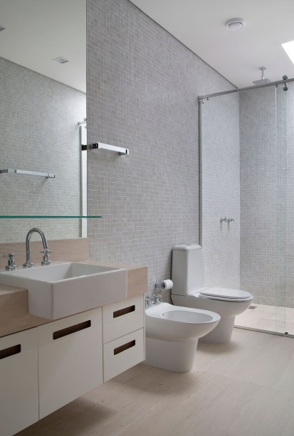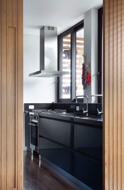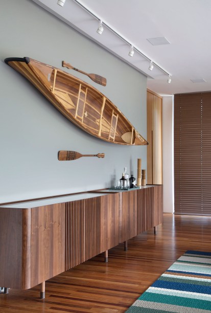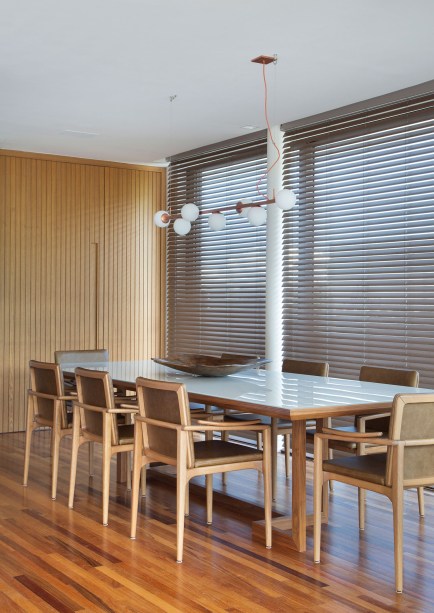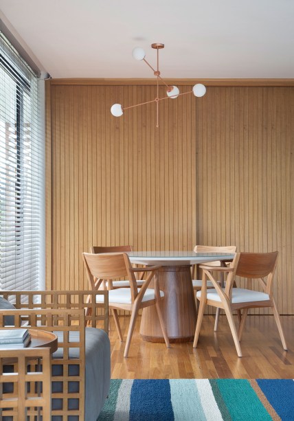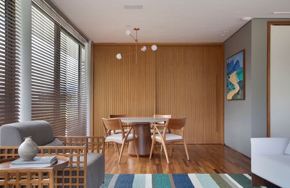 Por ser um imóvel recém-construído, todos os cômodos foram trabalhados pelo arquiteto, mas não houve modificações na planta original, que já era muito boa. A única modificação foi feita em marcenaria: o arquiteto criou uma porta de correr que permite isolar o home theater, quando necessário.