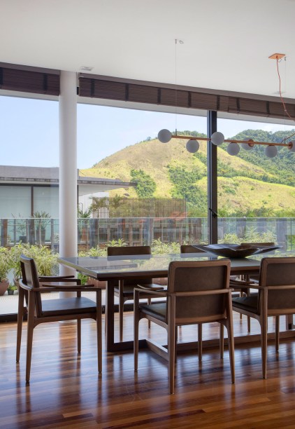 O principal destaque tanto na decoração quanto na arquitetura de interiores é o mobiliário, que é ao mesmo tempo sofisticado e descontraído. Além disso, toda a área interna interage com o ambiente externo por meio de um amplo terraço, que pode ficar totalmente integrado. Guarda-corpos de vidro transparente ajudaram a aumentar essa sensação de integração com a paisagem verde ao redor.