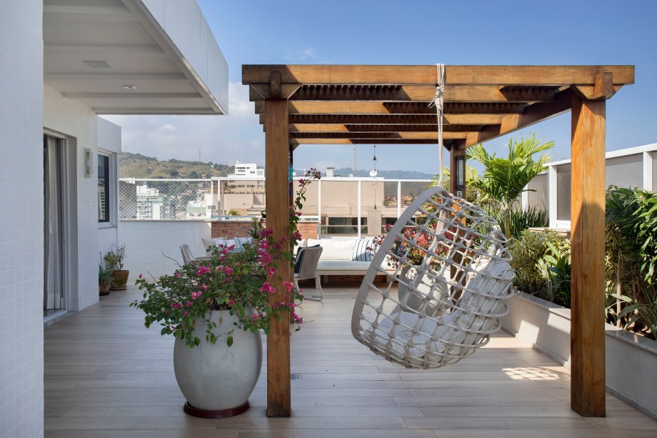“Os clientes pediram para integrar a cozinha com a sala, um jardim na área externa para deixar a cobertura com clima de casinha e uma banheira de imersão na suíte deles. Na decoração, eles pediram cores neutras e claras e madeira natural também clara”, conta Ikeda.