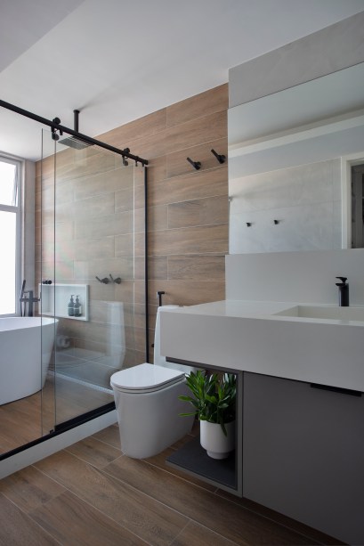 Segundo Ikeda, as cores claras, como branco, off white e cinza, deixaram os ambientes visualmente mais leves e “solares”, enquanto o carvalho americano – presente em algumas partes da marcenaria – cumpriram o papel de “aquecer” os espaços, trazendo a sensação de conforto e acolhimento.