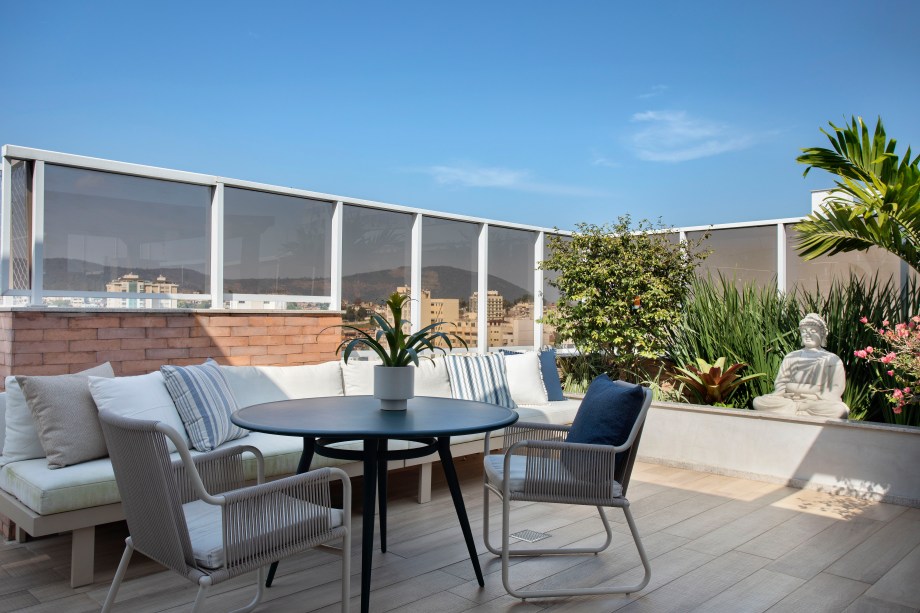 Um jovem casal de empresários, com um filho de um ano, estava à procura de uma cobertura linear e compacta para morar e encontrou esse imóvel com 270m² de área total e 149m² de área construída, em Icaraí, que é, na verdade, resultado da união de apartamentos vizinhos de cobertura.