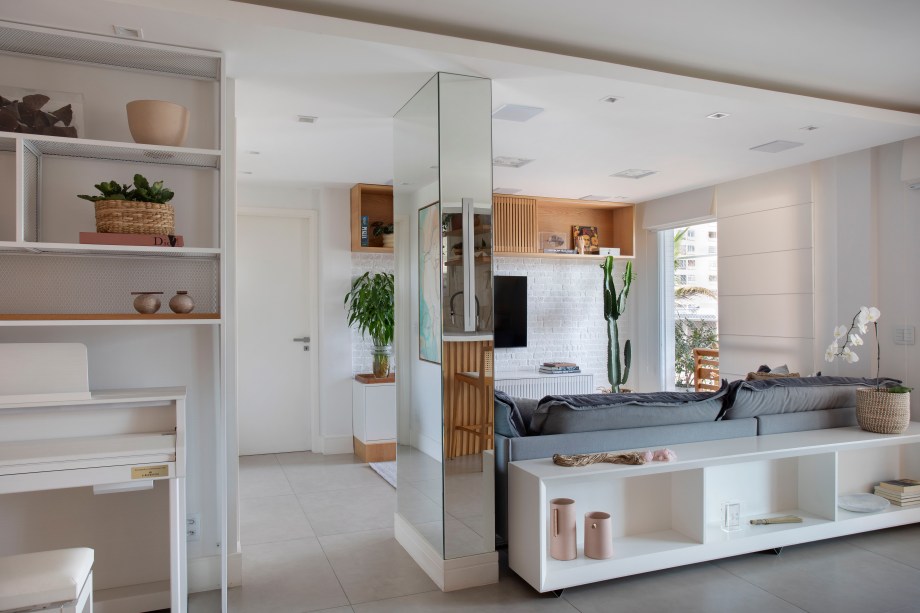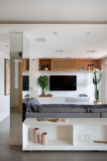No meio da sala, o sofá cinza azulado voltado para a tv e a estante-aparador branca e baixa voltada para a cozinha formam uma espécie de “ilha” que, além deixar o layout a com circulação mais fluida, se tornou o ponto focal do espaço.